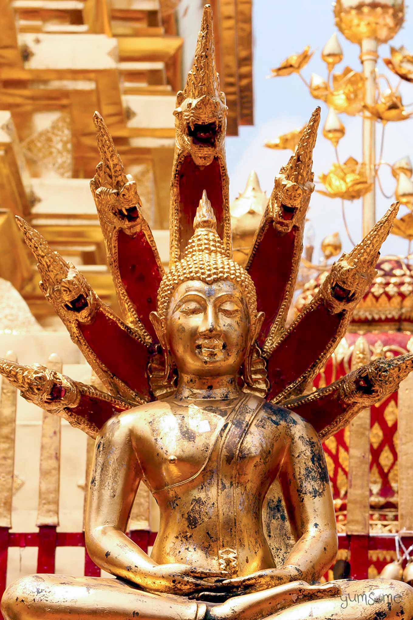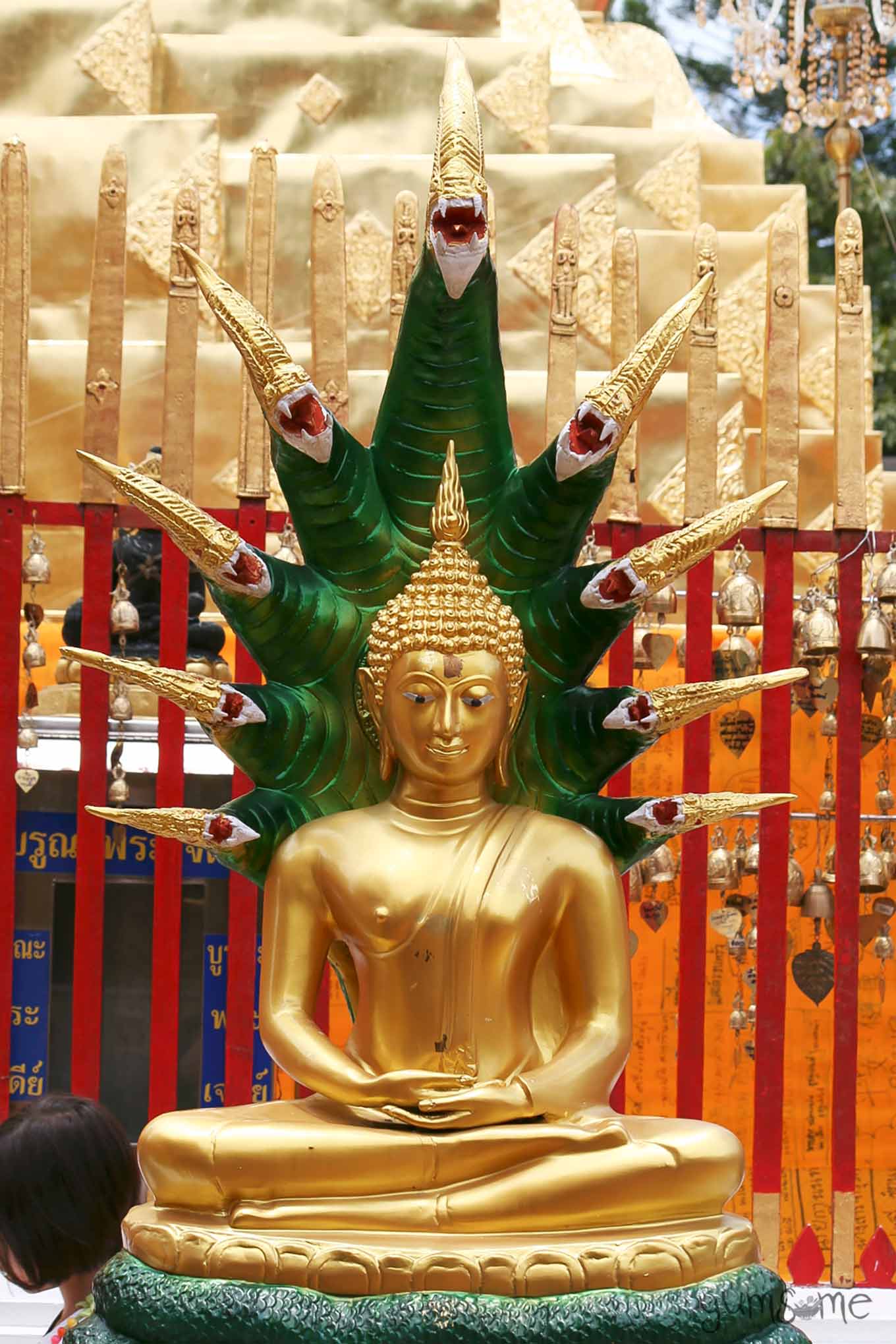 Once you've walked up the steps, past the giant memorial to Khruba Sri Vichai - the much-venerated monk responsible for building the road up the mountain to the wat (as well as for building many other temples), you can either take the funicular, which costs 20 baht, or you can ascend the 309 steps, flanked on either side by beautiful nagai, whose bodies form the balustrade of the steps. Entry to the wat costs 30 baht.